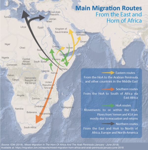 Migration routes from East and Horn of Africa // Rutas migratorias desde el Este y el Cuerno de África. Cortesía: OIM (2018).
