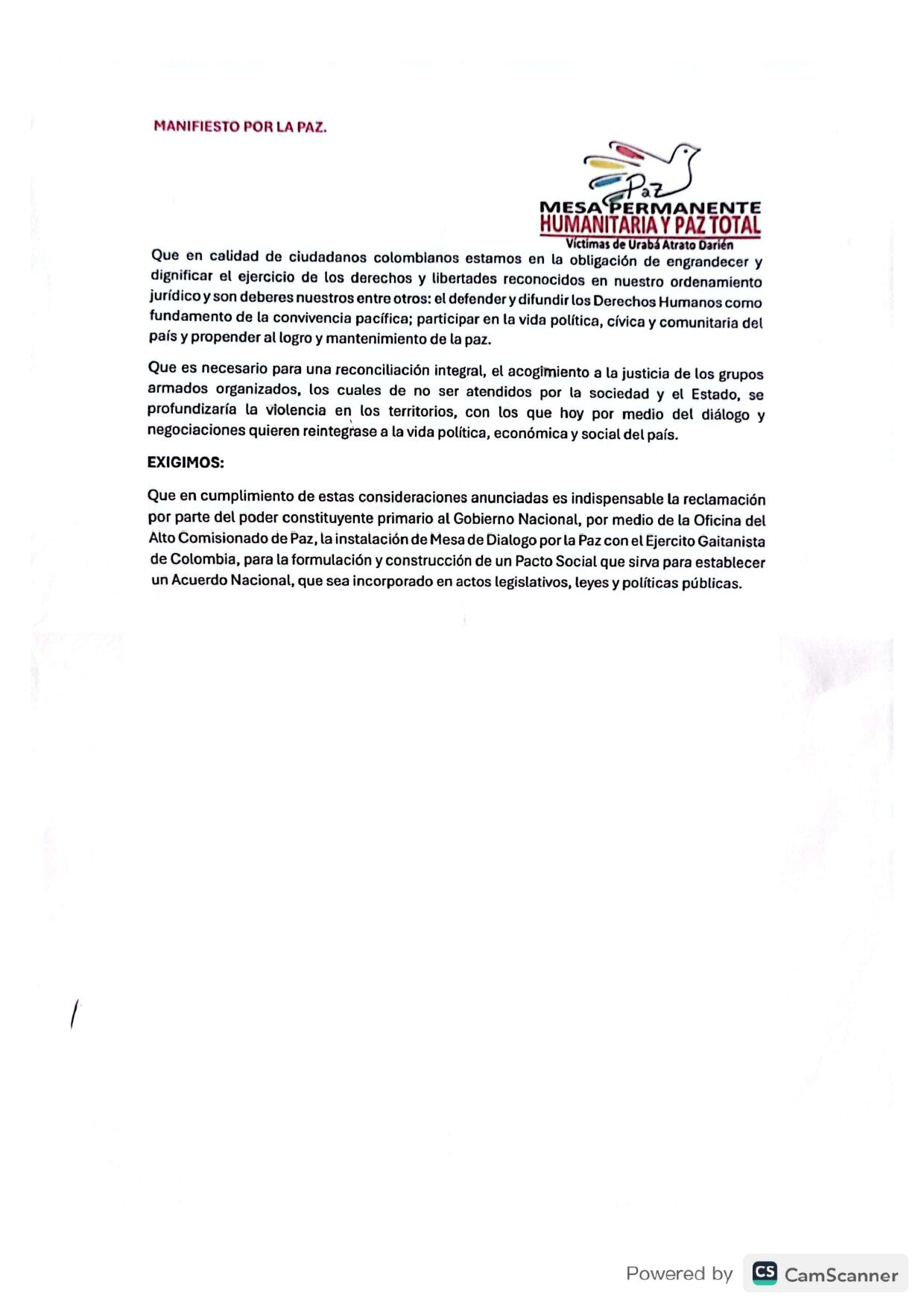 A través de un comunicado, el cual titularon “Manifiesto por la Paz”, la Mesa Permanente de Víctimas del Urabá, Atrato y Darién le exigieron al Gobierno Nacional la instalación de una Mesa de Dialogo de Paz con el Ejercito Gaitanista de Colombia, conocido también como las Autodefensas Gaitanistas de Colombia o el Clan del Golfo. Esto con el objetivo de construir un pacto social que permita la reconciliación integral y la Paz para el territorio.