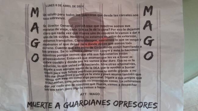 “Le reiteramos que por cada uno de nosotros que mueva vamos a despachar los que sean, pero algo le vamos hacer”, señalaron en el panfleto que iba dirigido también al director del Inpec.