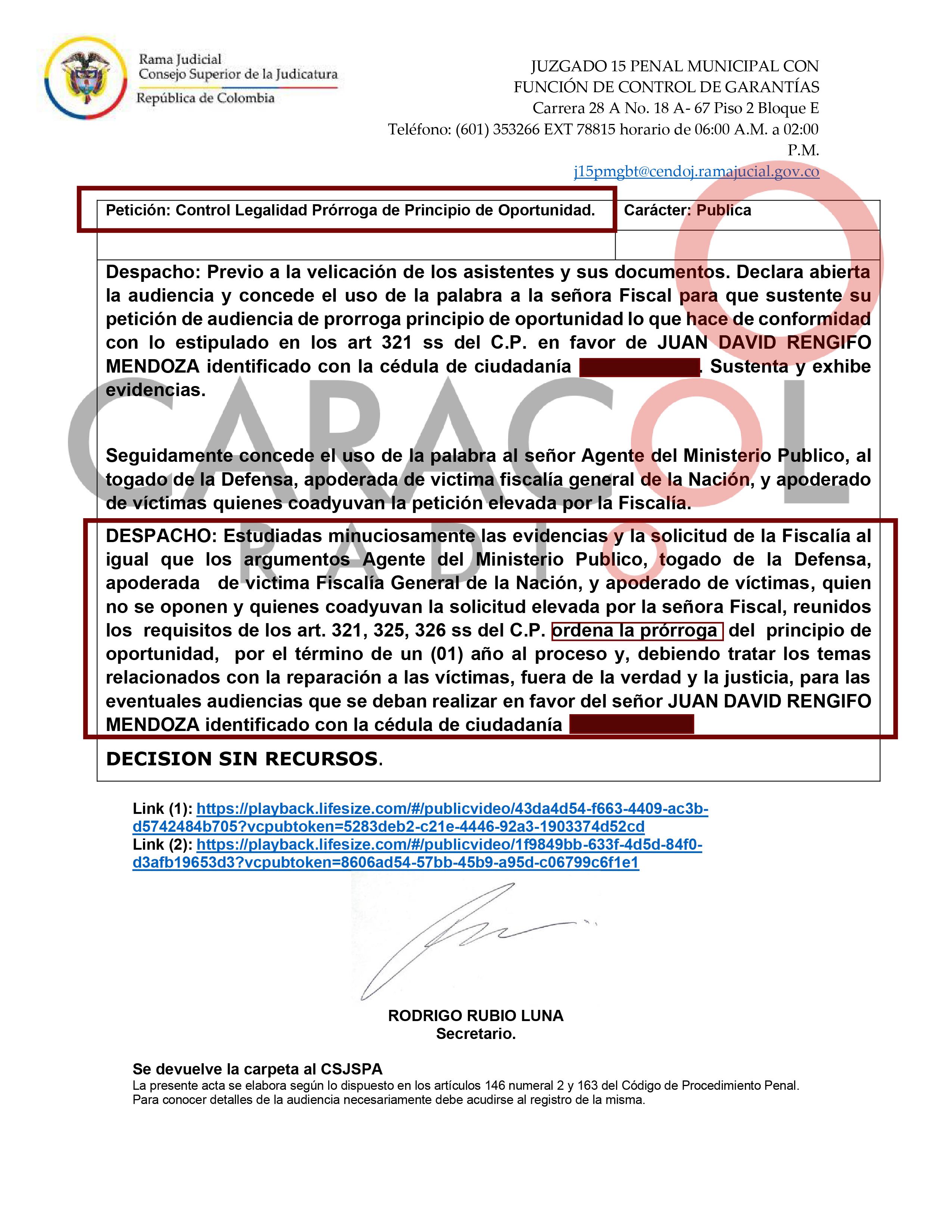 Caracol Radio conoció que esta semana el juzgado 15 de Garantías de Bogotá avaló la prórroga por un año más del principio de oportunidad que la Fiscalía le concedió a Juan David Rengifo, alias ‘La R’ es el testigo principal del caso “narcofiscales” por su colaboración efectiva con la justicia.