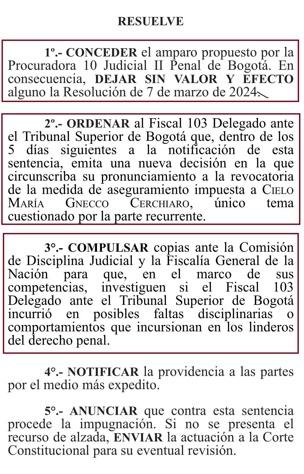“Por consiguiente, se dispone compulsar copias ante la Fiscalía General de la Nación y la Comisión de Disciplina Judicial”, se lee en el fallo.