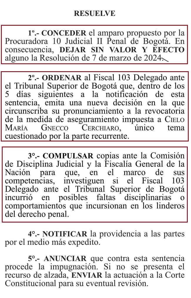 El Tribunal Superior de Bogotá tumbó la resolución de la Fiscalía que cerró el proceso en favor de Cielo María Gnecco. Ordenó reabrir el caso y le dio cinco días al fiscal 103 delegado ante el Tribunal para que emita una nueva decisión.