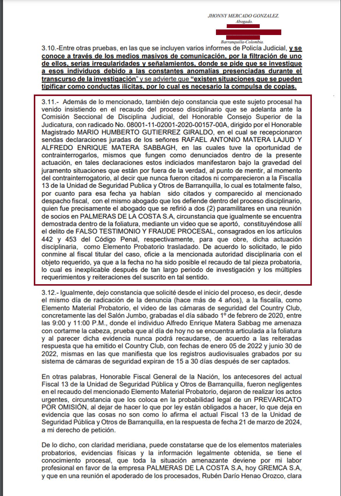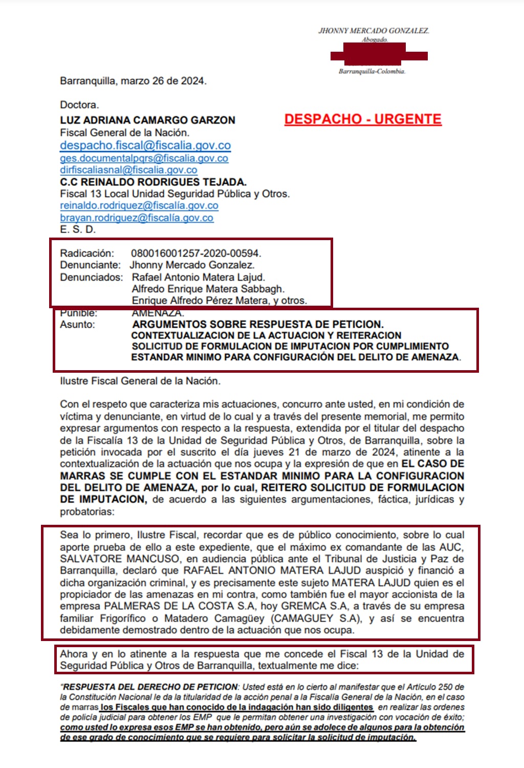 El abogado González denunció que pasaron cuatro años y no se indagó por una supuesta amenaza de muerte que le hicieron los empresarios Rafael Antonio Matera Lajud, señalado por varios ex paramilitares ser supuestamente alias ‘300′, Alfredo Enrique Matera Sabbagh, y Enrique Alfredo Pérez Matera, quien sería alias ‘400′.