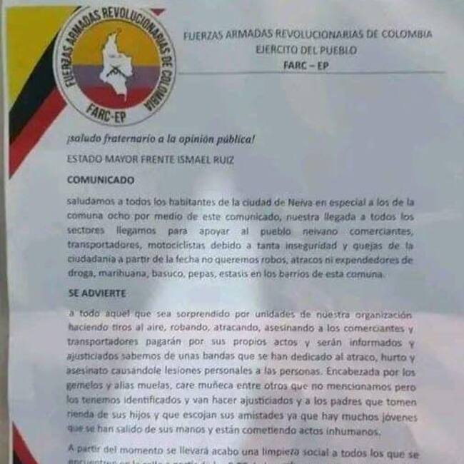 Luego de un estudio realizado por parte de las autoridades policiales de la capital a un panfleto que se dio a conocer en la comuna ocho de Neiva, en el cual amenazan y señales con nombres propios a jóvenes que han caído en la delincuencia, que de continuar cometiendo delitos serian blanco de un grupo al margen de la ley.