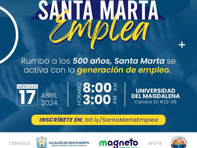 Según información de la administración, en esta Ferial Laboral “se ofrecerán 80 vacantes y 500 puestos de trabajo este 17 de abriel en la Universidad del Magdalena desde las 8 de la mañana hasta las 3 de la tasrde”. Para aprovechar esta oportunidad, dice la Alcaldía, es necesario inscribirse en el siguiente enlace: bit.ly/SantaMartaEmplea.