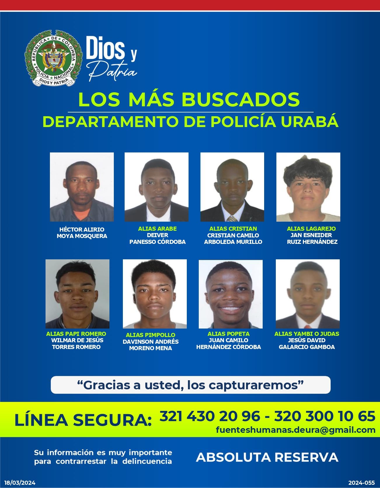 En el cartel también tiene identificado por los mismos delitos a: Héctor Alirio Moya Mosquera; Deiver Panesso Córdoba alias ‘Arabe’; Cristian Camilo Arboleda Murillo; Jan Esneider Ruiz Hernández alias ‘Lagarejo’; Wilmar de Jesús Torres Romero alias ‘Papi Romero’; Davinson Andrés Moreno Mena alias ‘Pimpollo’; Jesús David Galarcio Gamboa alias ‘Yambi o Judas’.