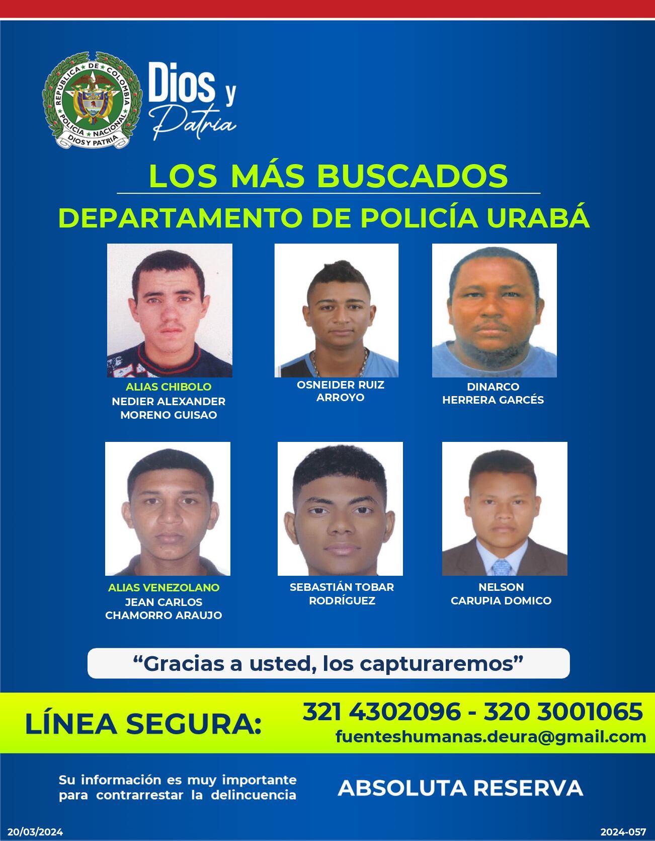 Mientras que el cartel de los más buscados en la misma subregión por el delito de homicidio es: Nedier Alexander Moreno Guisao alias ‘Chibolo’; Osneider Ruiz Arroyo; Dinarco Herrera Garcés; jean Carlos chamorro Araujo alias ‘venezolano’; Sebastián Tobar Rodríguez y Nelson Carupia Domicó.