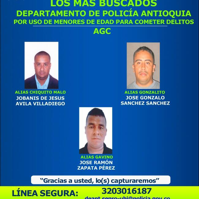 Este lunes 15 de abril, autoridades dieron a conocer el cartel de los 3 delincuentes más buscados en el departamento de Antioquia. La Policía de esta región identificó a estos 3 sujetos, quienes serían cabecillas del Clan del Golfo y son requeridos por la justicia, por instrumentalizar a menores de edad para cometer diferentes delitos.