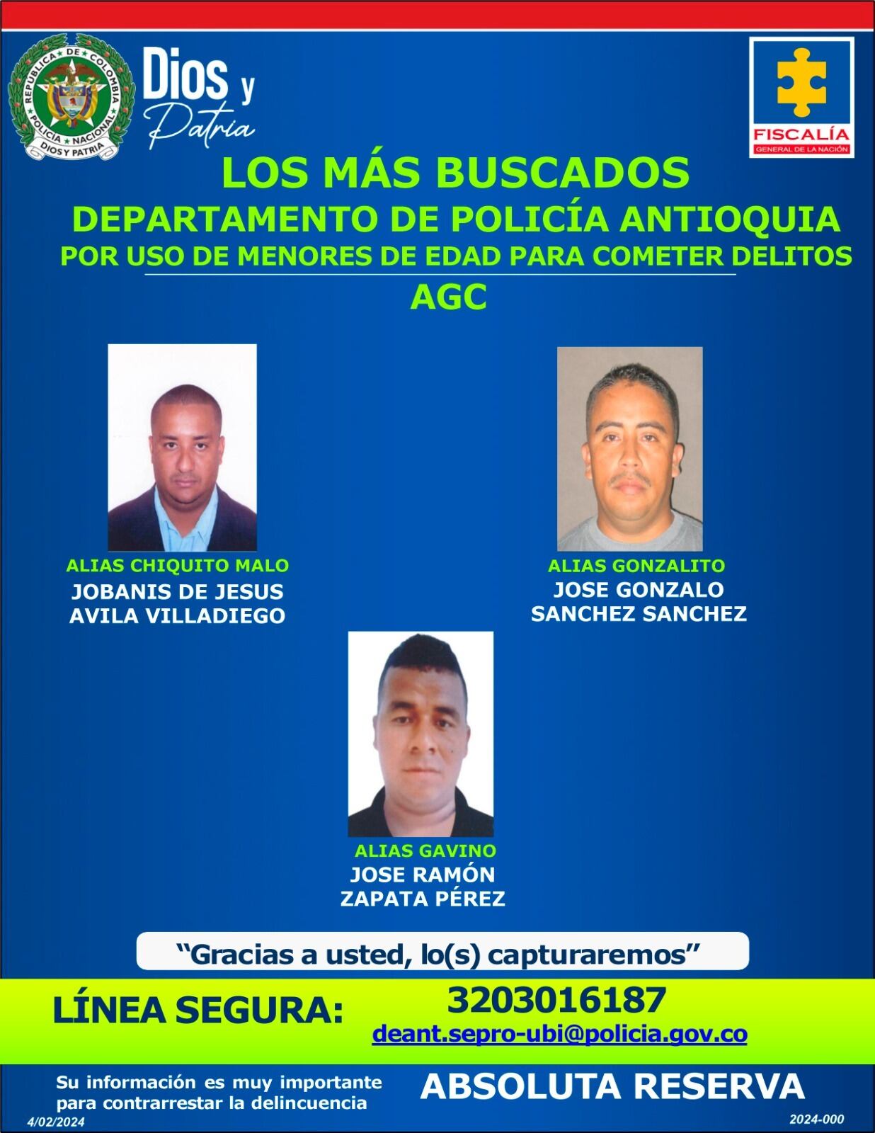 Este lunes 15 de abril, autoridades dieron a conocer el cartel de los 3 delincuentes más buscados en el departamento de Antioquia. La Policía de esta región identificó a estos 3 sujetos, quienes serían cabecillas del Clan del Golfo y son requeridos por la justicia, por instrumentalizar a menores de edad para cometer diferentes delitos.