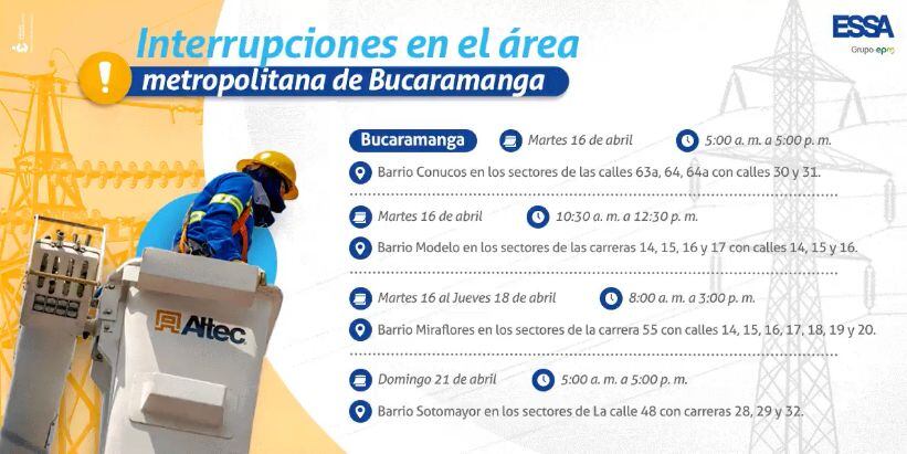 Barrio Modelo: desde las carreras 14,15, 16 y 17 con calles 14,15 y 16 se suspende el servicio desde las 10:30 a.m. hasta 12:30 p.m.; Conucos: calles 63a, 64, 64a con calles 30 y 31 el servicio se cortó desde las 5:00 a.m. hasta las 5:00 p.m.; Barrio Miraflores en la carrera 55 con calles 14,15,16,17,18,19 y 20 de 8:00 a.m. a 3:00 p.m. y en Sotomayor en los sectores de la calle 4B con carreras 28,29 y 32 de 5:00 a.m. a 5:00 p.m.