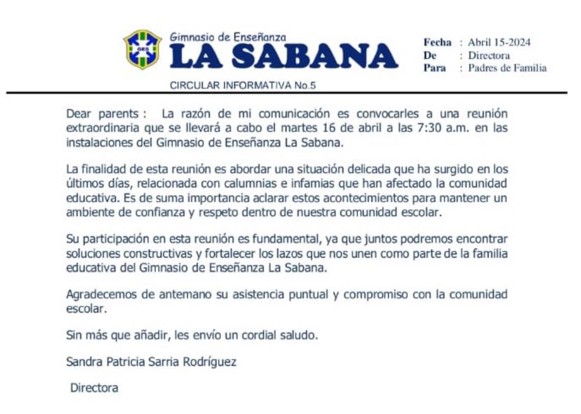 Comunicado del colegio Gimnasio de Enseñanza La Sabana.