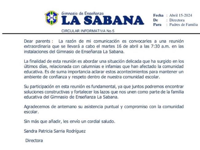 En la circular, la institución educativa indicó que el motivo de la reunión es para “abordar la situación relacionada con calumnias e infamias que han afectado a la comunidad educativa”, según el comunicado.