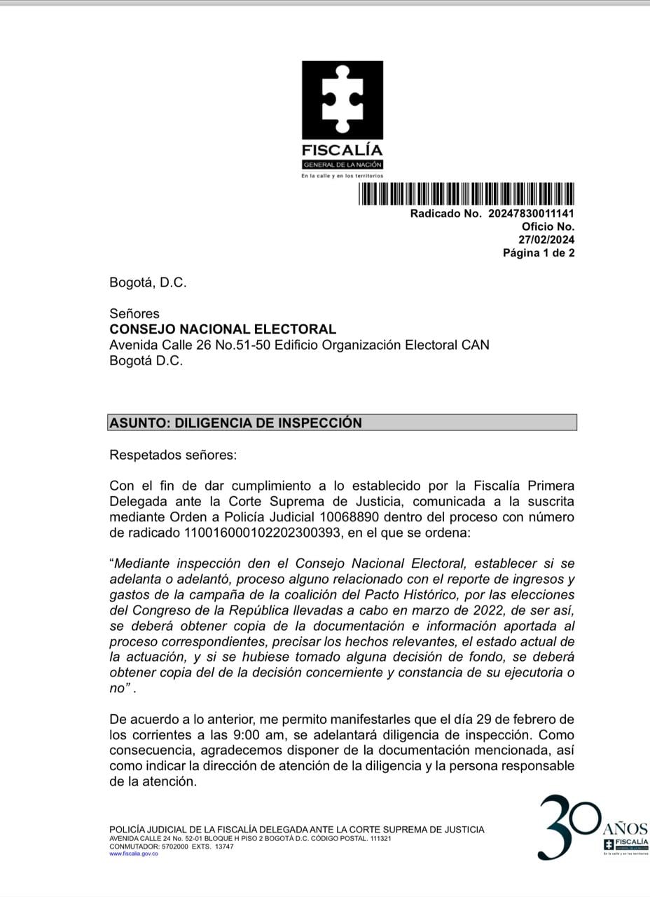 Precisamente, en febrero de este año, la Fiscalía hizo una inspección judicial al Consejo Nacional Electoral, en la que se pidió copia de la documentación y el reporte de ingresos que entregó el Pacto Histórico por las elecciones a Congreso de la República en 2022.