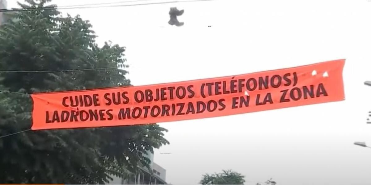 En la localidad de Barrios Unidos, habitantes ponen valla alertando sobre los ladrones motorizados en la zona/ Cortesía: YouTube @Citytv
