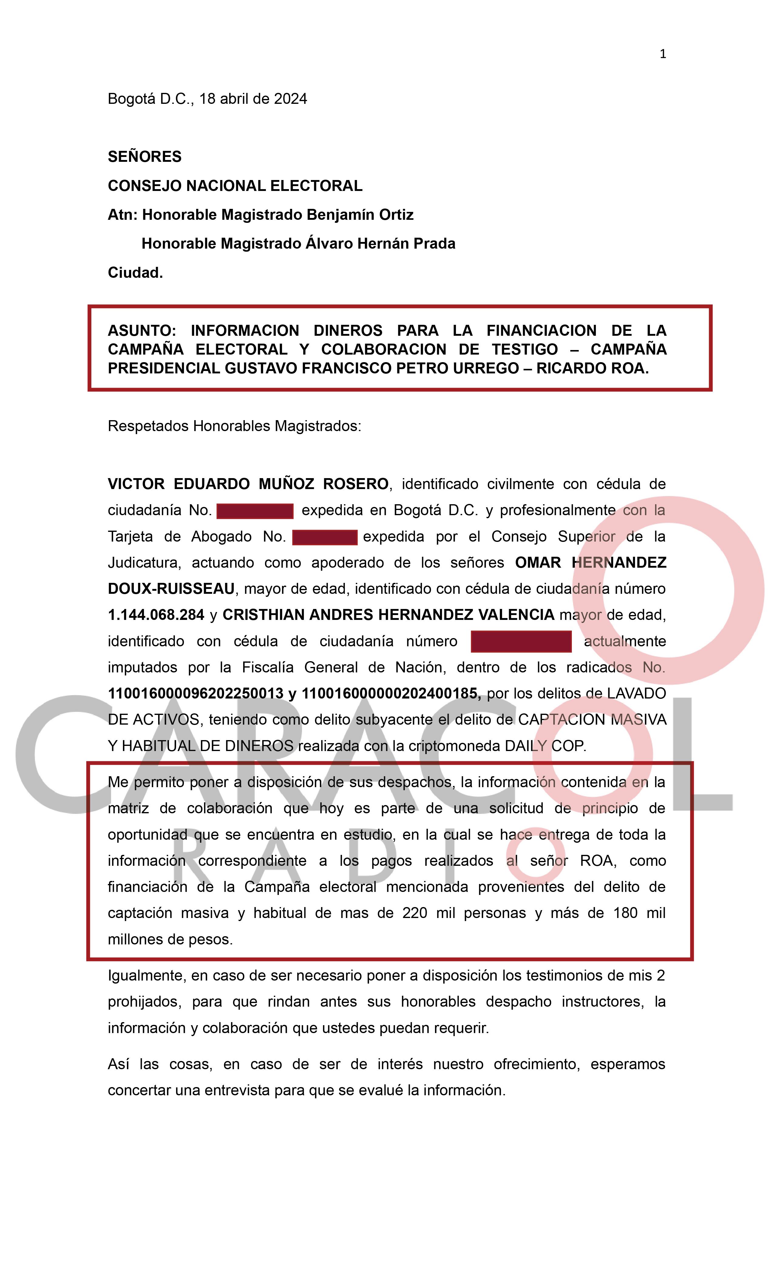 Oficio al CNE en el que testigo del caso criptomonedas ofrece información por presunta financiación irregular a la campaña Petro Presidente