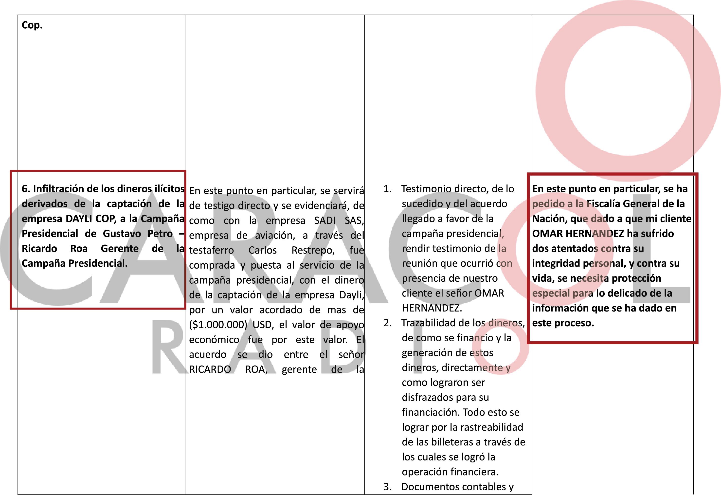 Se denomina “Infiltración de los dineros ilícitos derivados de la captación de la empresa Dayli Cop, a la Campaña Presidencial de Gustavo Petro”, y menciona al entonces gerente de la campaña presidencial y hoy presidente de Ecopetrol Ricardo Roa.