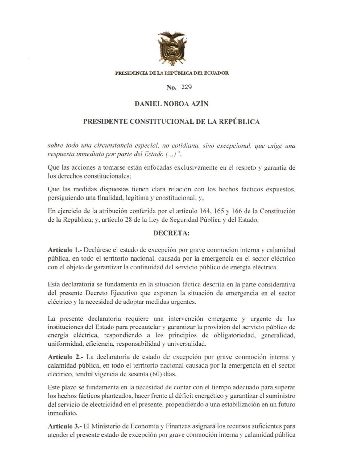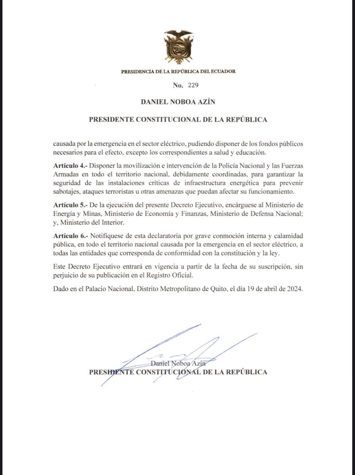 El presidente de Ecuador, Daniel Noboa, declaró este viernes un estado de excepción a nivel nacional por 60 días por la crisis energética que atraviesa el país, con miras a evitar “ataques terroristas” contra la infraestructura para el suministro de electricidad en medio de la violencia narco.