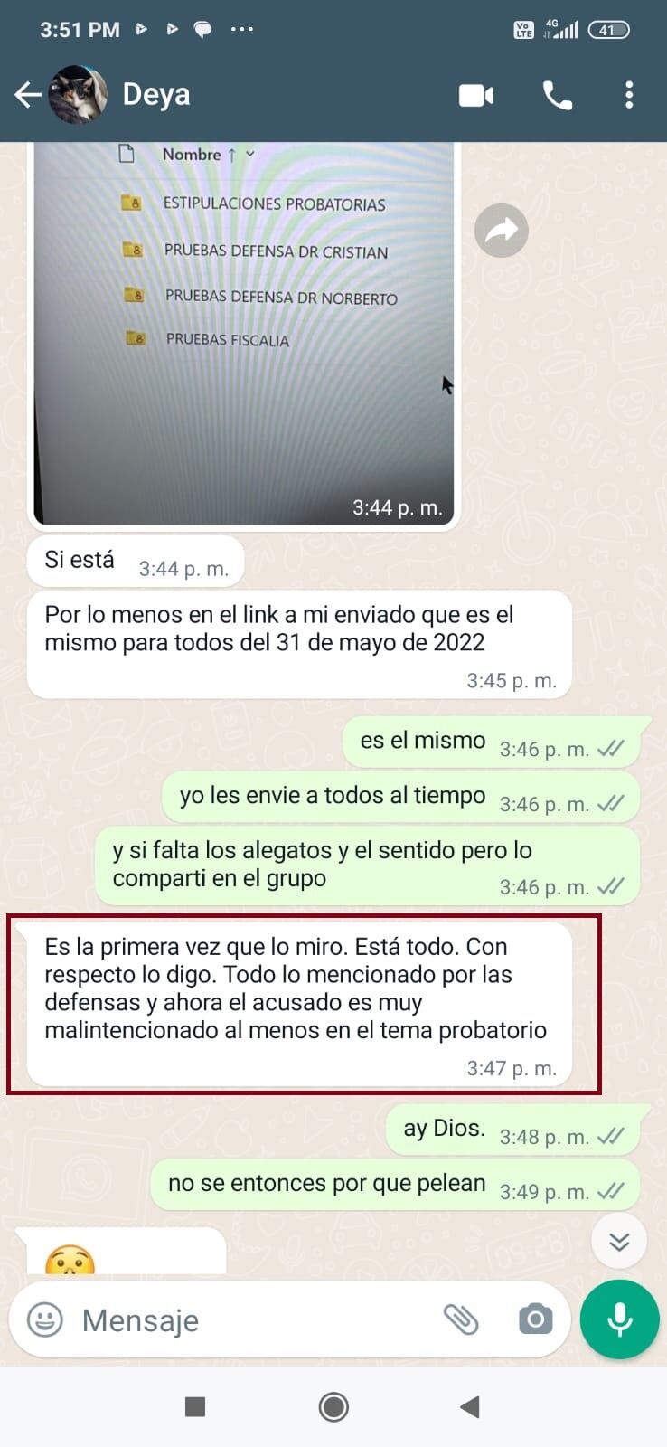 Todo comenzó por un mensaje de la fiscal en el grupo de WhatsApp del caso, en las que se refería a que “no tenía respuestas por la demora en ese proceso”. Lo que dio a entender que se estaba comunicando con el juzgado sin que la defensa lo supera.