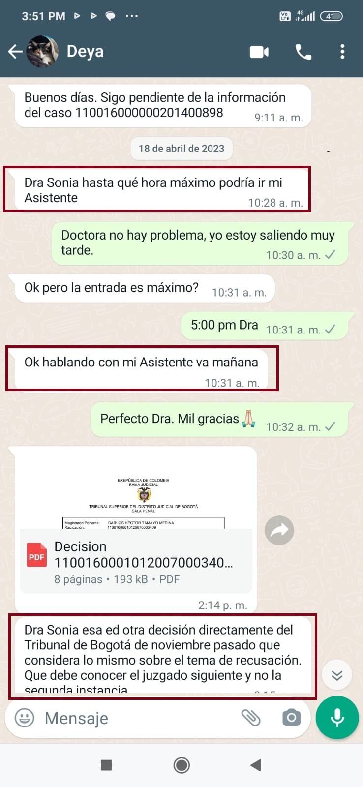 Y es aquí donde se descubre que el juzgado 41 de conocimiento tenía un chat alterno con la fiscal, sin que la defensa lo supiera, y donde quedó evidencia de que presuntamente la fiscal le decía qué hacer a la juez. (mostrar chats)