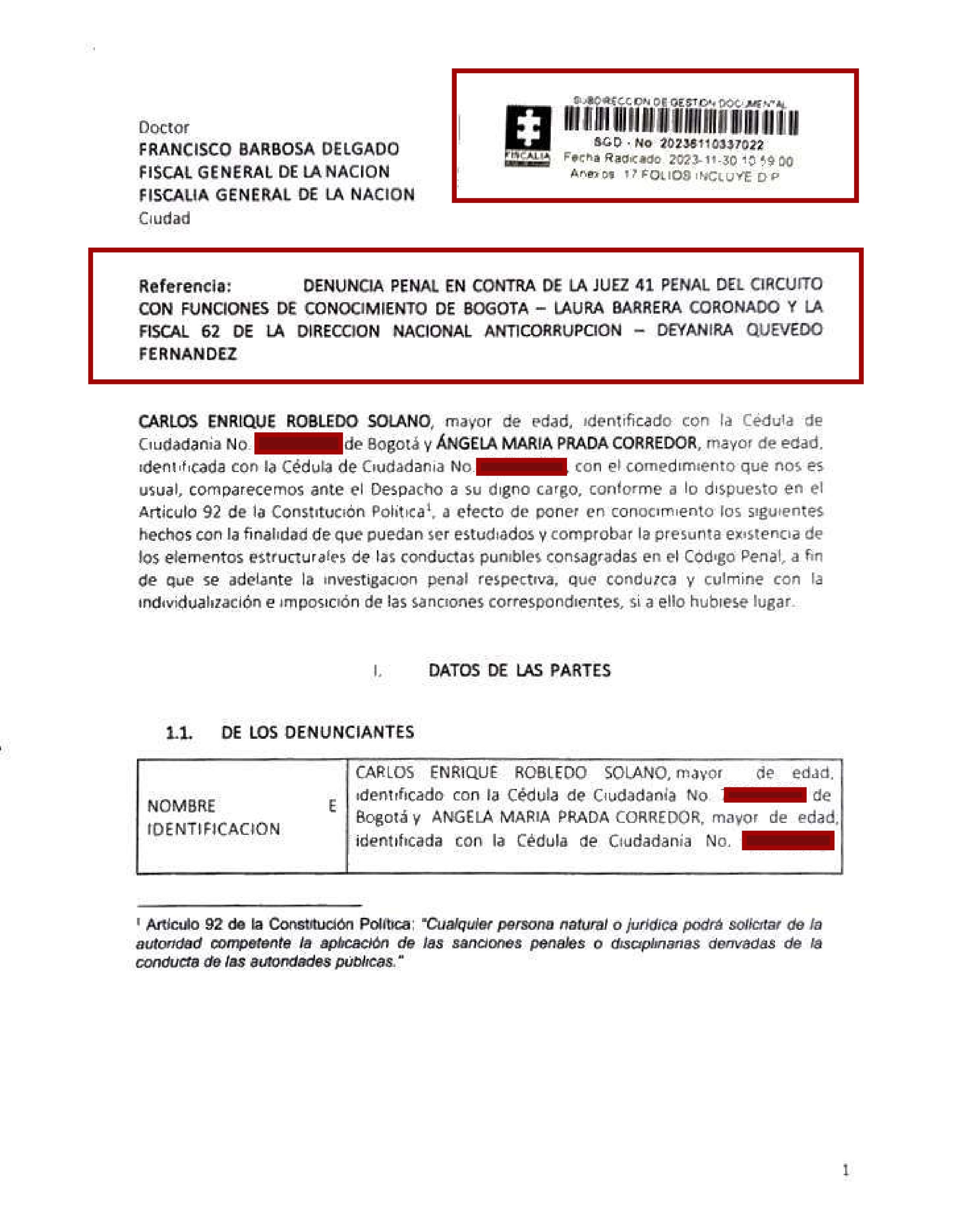 Desde finales de 2023, ante la Fiscalía y la Comisión de Disciplina Judicial, fueron denunciados la jueza 41 de Conocimiento Penal del Circuito de Bogotá, Laura Barrera, ella es recordada porque fue una de las juezas que negó la preclusión del caso Álvaro Uribe Vélez. También fue denunciada la fiscal 62 anticorrupción Deyanira Quevedo.