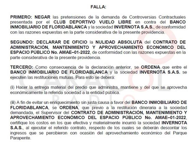 La demanda de nulidad absoluta del contrato había sido interpuesta por el Club Deportivo Vuelo Libre ante el juzgado 15 administrativo del circuito judicial de Bucaramanga. El club pretendía que la justicia ordenara las respectivas restituciones al Banco Inmobiliario de Floridablanca, BIF.