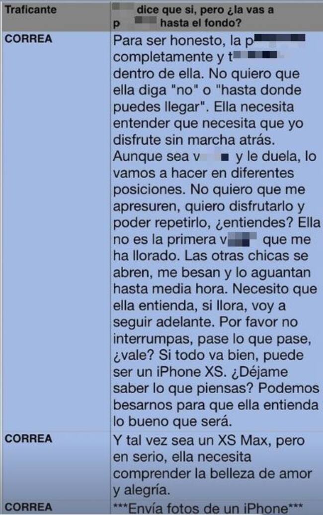 Según la información obtenida por los investigadores, las comunicaciones de Correa daban cuenta de sus “exigencias” a la traficante sexual de Medellín que le proporcionaba a las menores. En estas comunicaciones, se da cuenta de que el acusado ofrecía 300.000 pesos y un celular iPhone 7 u 8 a las niñas como “premio” a cambio de acceder a sus peticiones.