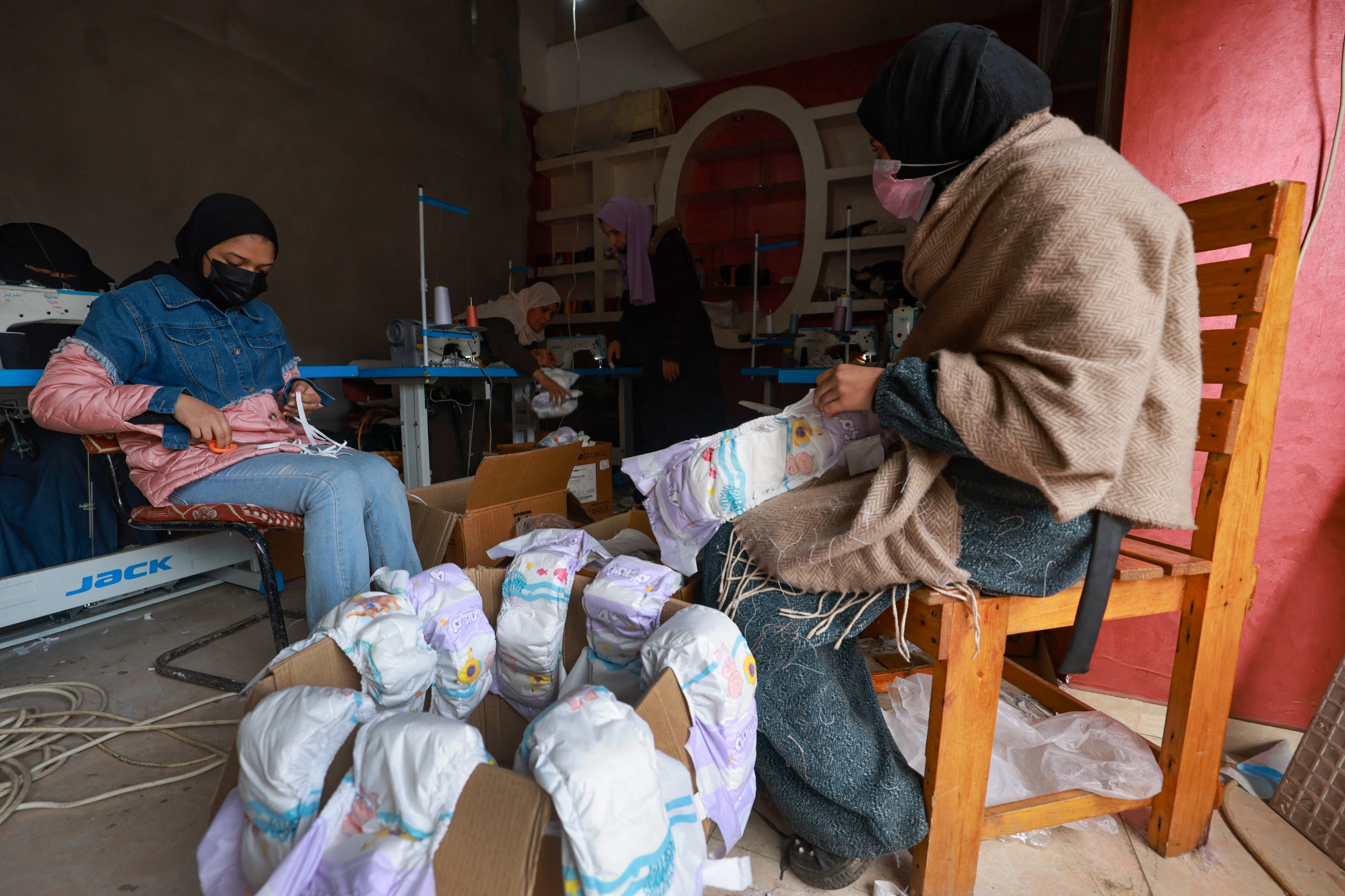 Creación de pañales para bebés en Palestina ante la imposibilidad de traerlos del exterior por el bloqueo israelí ante la entrada de ayudas a la Franja de Gaza. (Foto: MOHAMMED ABED/AFP via Getty Images) / MOHAMMED ABED