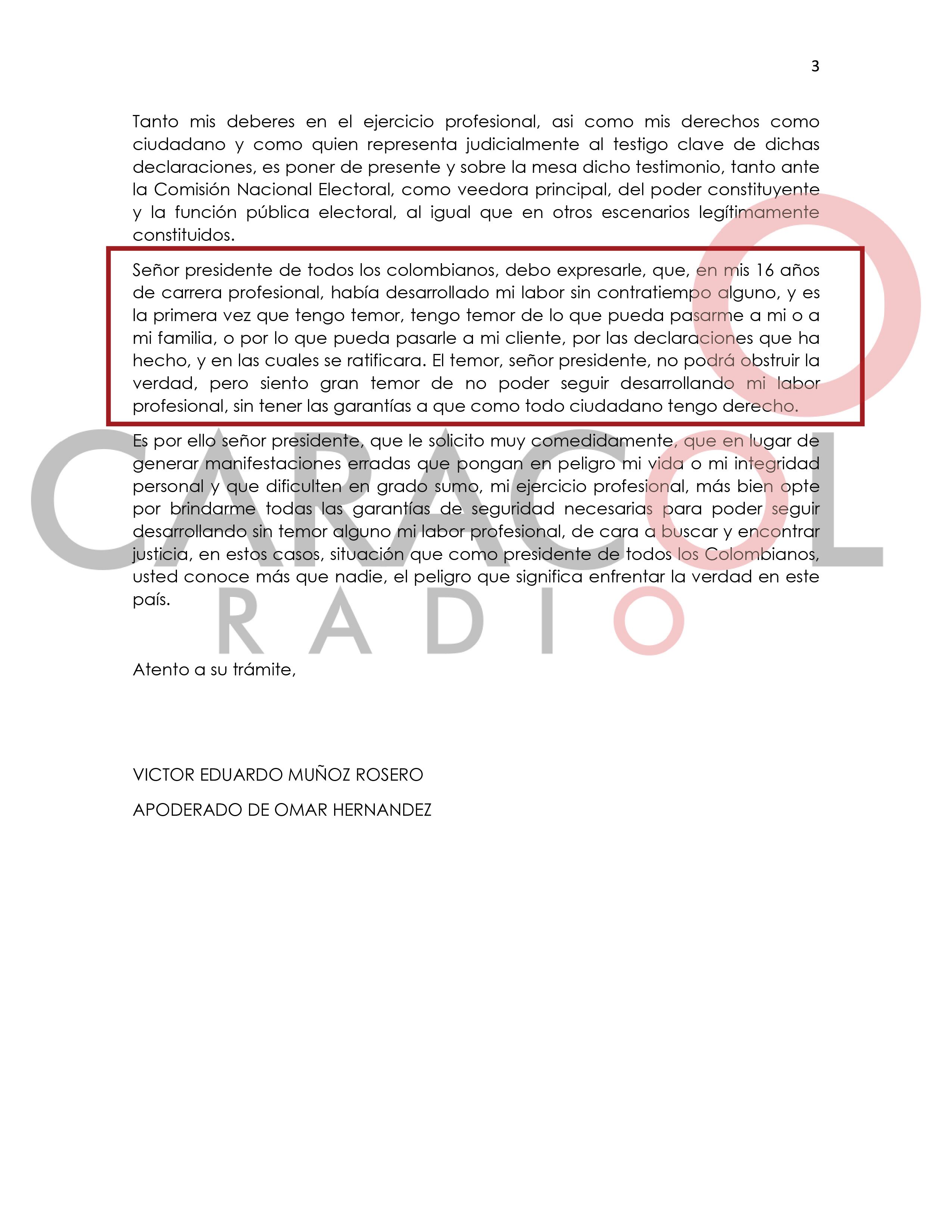 “Señor presidente de todos los colombianos, debo expresarle, que, en mis 16 años de carrera profesional, había desarrollado mi labor sin contratiempo alguno, y es la primera vez que tengo temor, tengo temor de lo que pueda pasarme a mi o a mi familia, o por lo que pueda pasarle a mi cliente, por las declaraciones que ha hecho, y en las cuales se ratificara. El temor, señor presidente, no podrá obstruir la verdad, pero siento gran temor de no poder seguir desarrollando mi labor profesional, sin tener las garantías a que como todo ciudadano tengo derecho”.