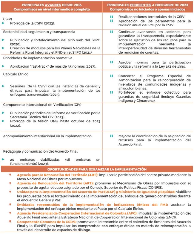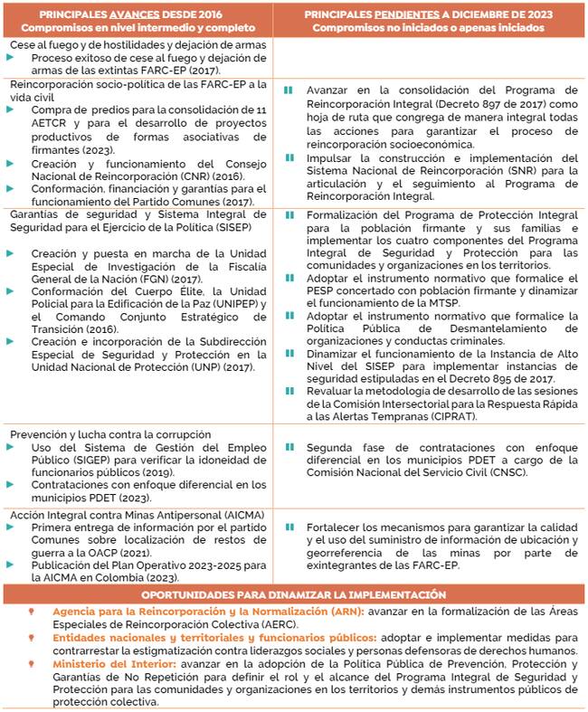 A continuación encontrará (dividido por puntos) los principales avances logrados en la implementación de los acuerdos desde el 2016, los puntos pendientes con corte a diciembre de 2023 y las oportunidades que tiene el gobierno para acelerar su implementación.