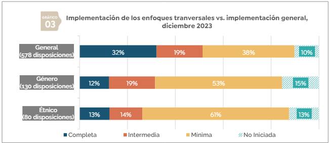 Uno de los aspectos destacados es que los enfoques transversales aún no han sido del todo apropiados e implementados hacia el cierre del año 2023, en particular se registra una gran brecha en los enfoques étnico y de género cuya implementación no ha sido viable, dejando el 74% de las disposiciones del enfoque étnico y el 68% de las disposiciones de enfoque de género sin aplicación.