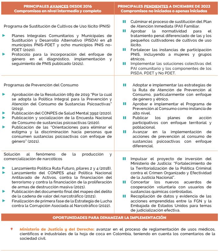 A continuación encontrará (dividido por puntos) los principales avances logrados en la implementación de los acuerdos desde el 2016, los puntos pendientes con corte a diciembre de 2023 y las oportunidades que tiene el gobierno para acelerar su implementación.