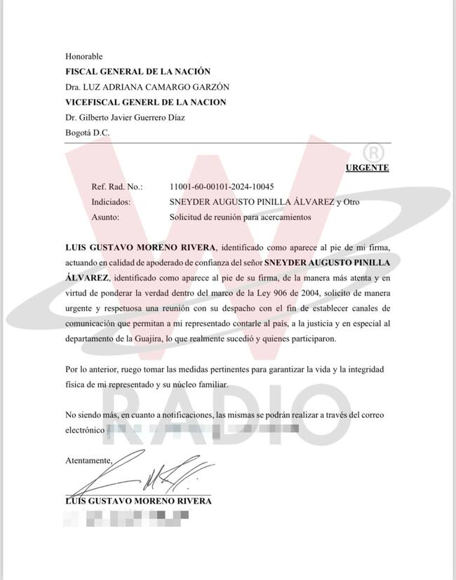 La comunicación del abogado de Sneyder Augusto Pinilla a la fiscal y al vicefiscal pide “de manera urgente y respetuosa una reunión para establecer canales de comunicación que le permitan a Sneyder Pinilla contarle al país, a la justicia y en especial al departamento de La Guajira, lo que realmente sucedió y quienes participaron”.