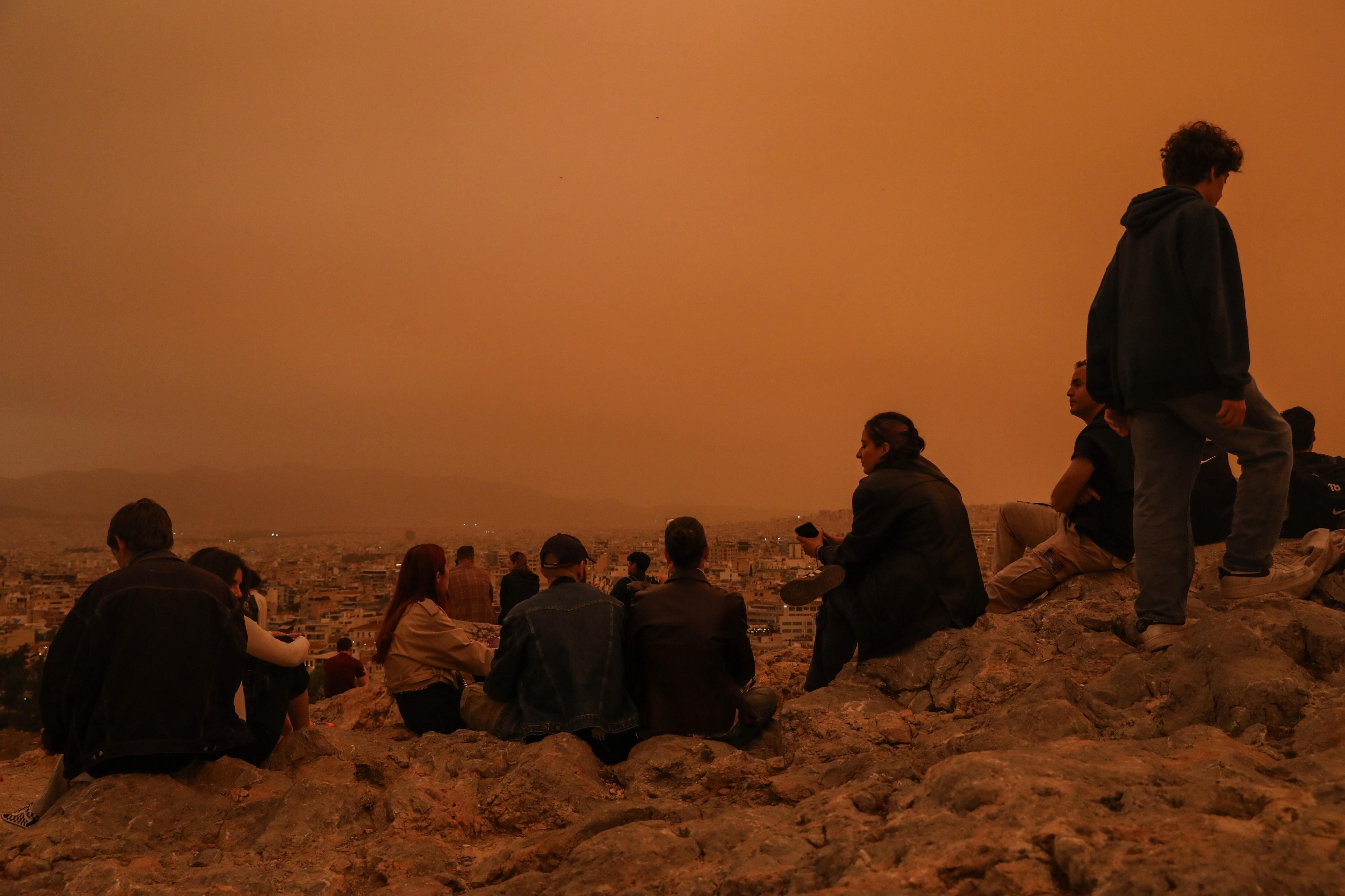 No obstante, algunos atenienses decidieron subir a algunas de las colinas de Atenas para disfrutar desde lo alto de la vista del tono anaranjado que envuelve la capital.