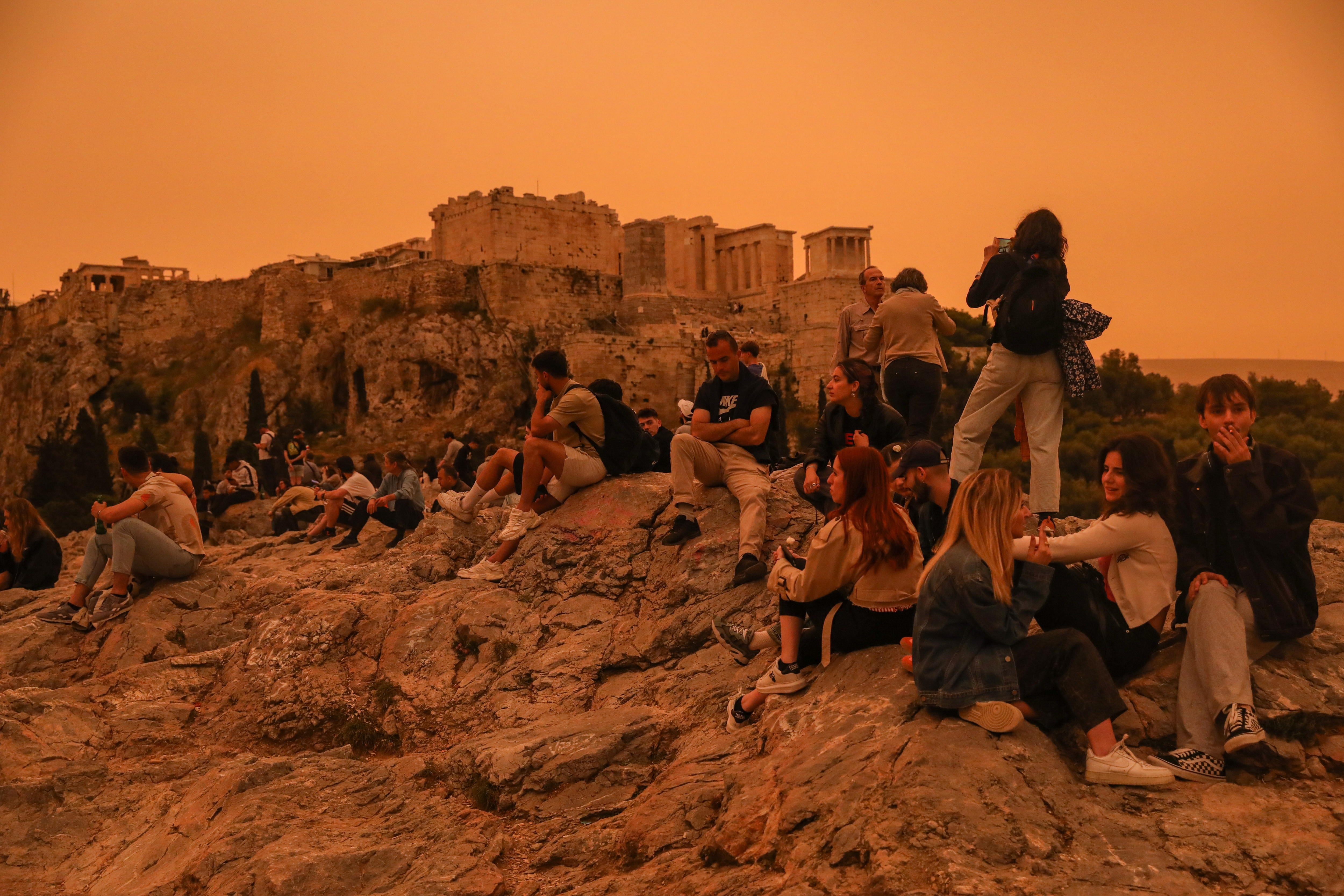 Athens (Greece), 23/04/2024.- People stroll around the Acropolis area while African dust covers the sky of Athens, Greece, 23 April 2024. According to the National Observatory of Athens, the atmospheric circulation over Greece favors the transfer of warm air masses from Africa to Greece, resulting in very high temperatures and the transfer of significant amounts of Saharan dust. (Grecia, Atenas) EFE/EPA/GEORGE VITSARAS / GEORGE VITSARAS