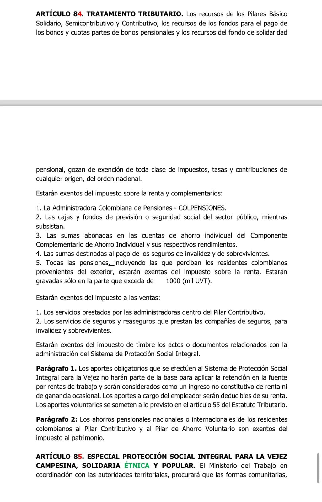 “El artículo 84 es toda una reforma tributaria enmascarada dentro de la reforma pensional, porque se diseña un régimen tributario para Colpensiones, exonerando de todos los gravámenes, tasas y contribuciones”, señaló.