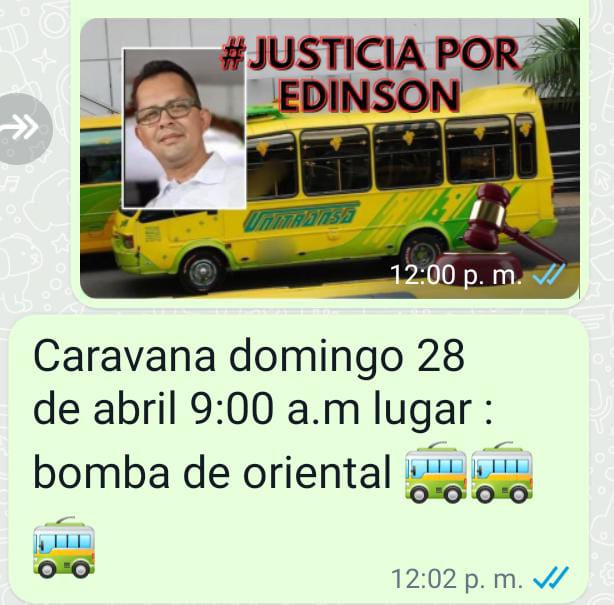 Conductores de la empresa de transporte público Unitransa convocaron para este domingo 28 de abril una caravana, y exigir que las autoridades capturen al responsable de dejar en Cuidados Intensivos a Edinson Olarte Ortega. El presunto delincuente es conocido como alias el “Zorro”.