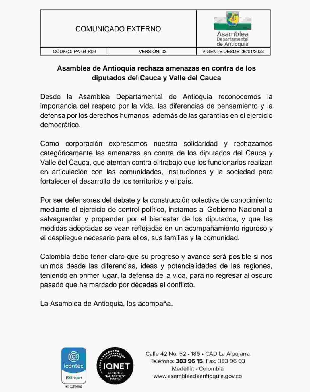 “Desde la Asamblea Departamental de Antioquia reconocemos la importancia del respeto por la vida, las diferencias de pensamiento y la defensa por los derechos humanos, además de las garantías en el ejercicio democrático. Como corporación expresamos nuestra solidaridad y rechazamos categóricamente las amenazas en contra de los diputados del Cauca y Valle del Cauca, que atentan contra el trabajo que los funcionarios realizan en articulación con las comunidades, instituciones y la sociedad para fortalecer el desarrollo de los territorios y el país”, se lee en la misiva.