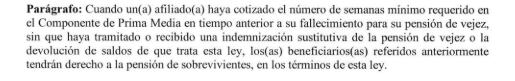 - Los miembros del grupo familiar del afiliado al sistema que fallezca, siempre y cuando este hubiere cotizado cincuenta (50) semanas dentro de los tres (3) últimos años inmediatamente anteriores al fallecimiento. En este caso el monto será del 80% que le hubiera correspondido en su pensión por vejez, una vez que cumpla las siguientes condiciones:
