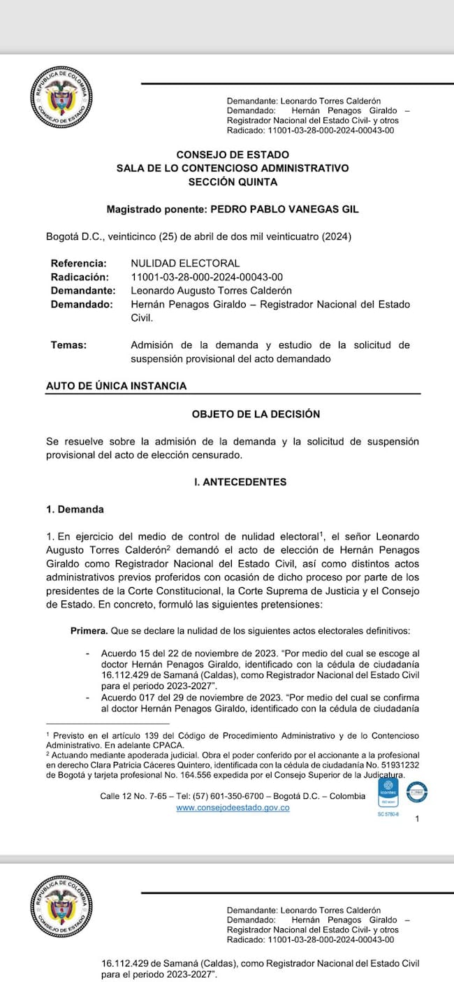 El demandante, Leonardo Augusto Torres, alega que Penagos se encuentra inhabilitado por haber sido magistrado del Consejo Nacional Electoral en los 12 meses anteriores a su inscripción al concurso y también falsedad en la declaración juramentarla de no estar incurso en ninguna prohibición para ser elegido como registrador.