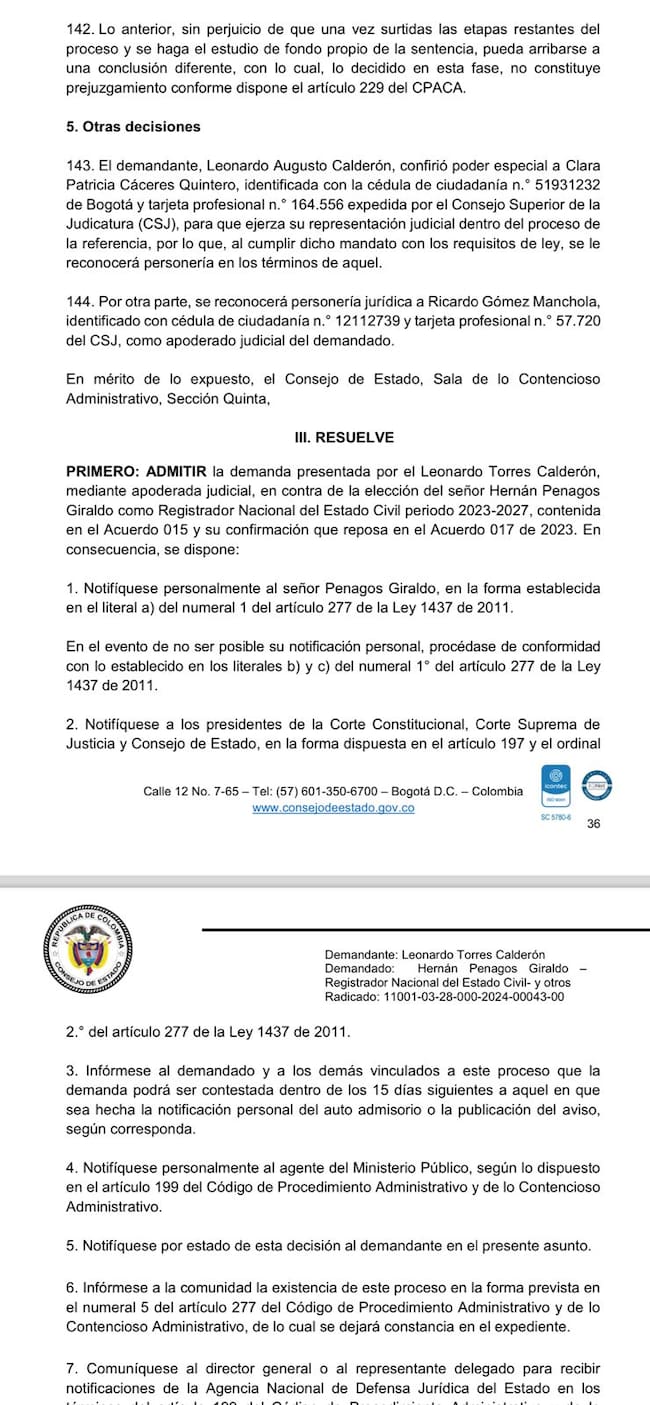 El Consejo de Estado admitió para su estudio una demanda en contra de la elección de Hernán Penagos como registrador nacional.