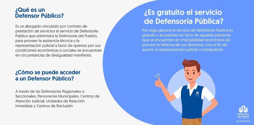 Dentro de todas sus funciones hay un servicio que para las personas que no cuentan con el dinero para pagar un abogado la Defensoría se los proporciona de manera gratuita.