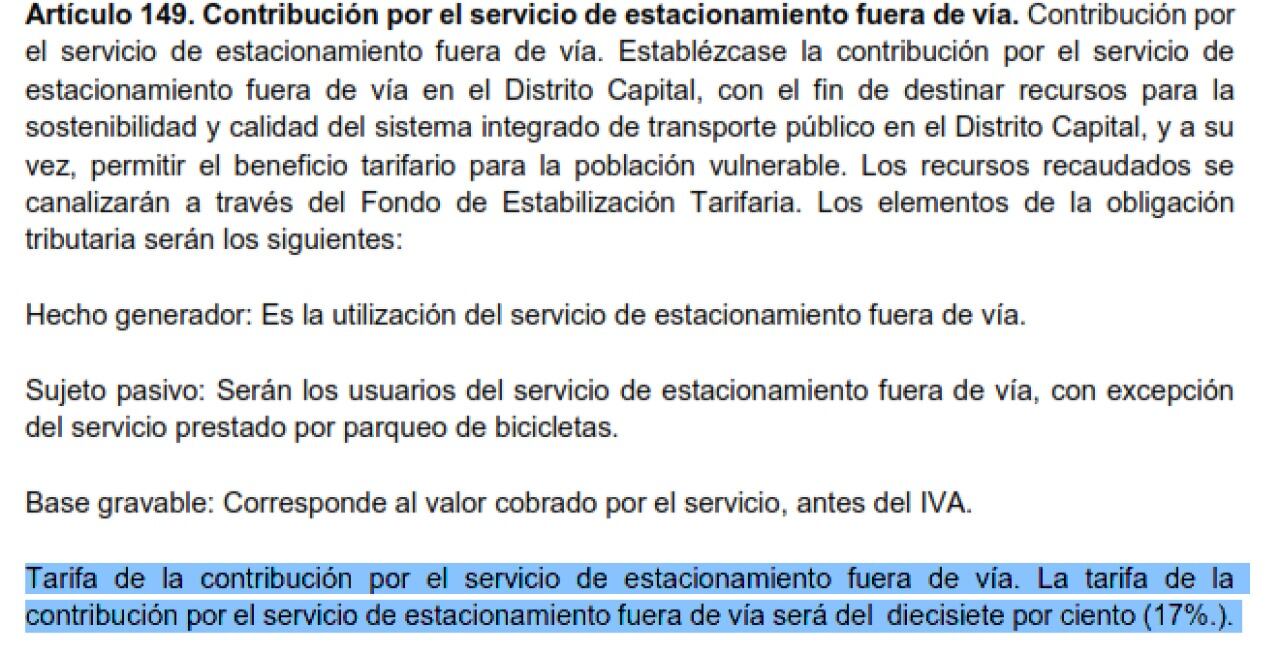 En el artículo 149 que se denomina Contribución por el servicio de estacionamiento fuera de vía, el distrito propone que la tarifa de la por el servicio de parqueadero sea del 17%.