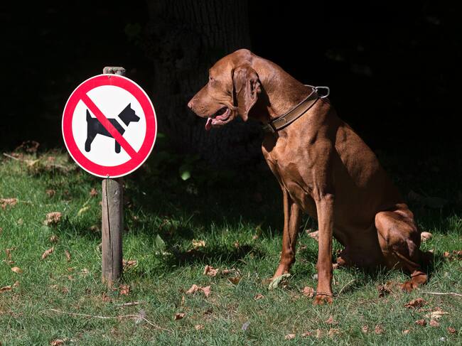 Perro observando una señal de prohibición de caninos (Foto vía Getty Images) / Cyrille Gibot