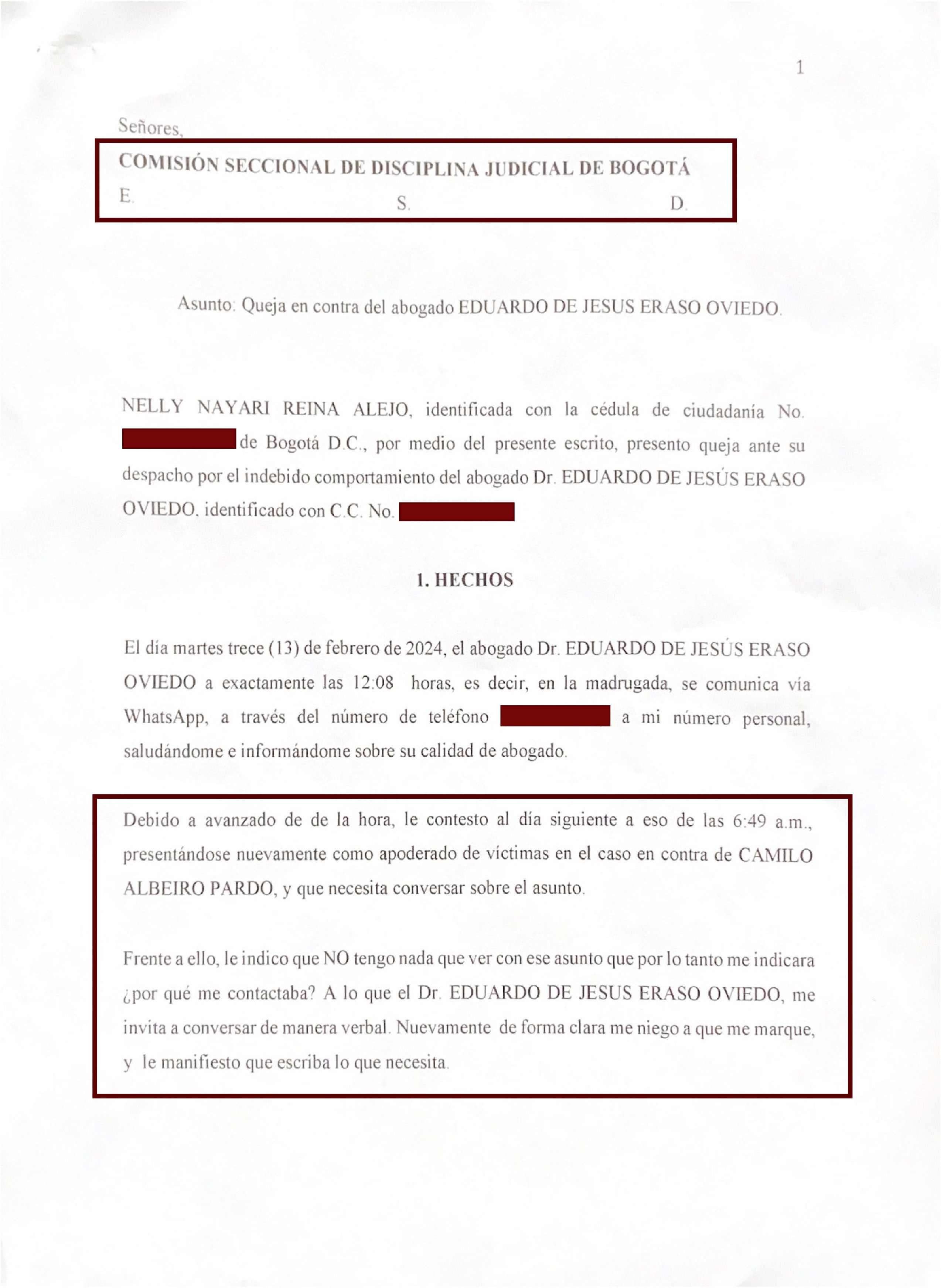 Se conoció que, quien radicó la queja fue una señora que se llama Nelly Nayari Reina. En el documento dice que, el abogado la contactó vía WhatsApp, se presentó como apoderado de víctimas y que necesitaba hablar con ella por proceso penal que se sigue contra el exalcalde.