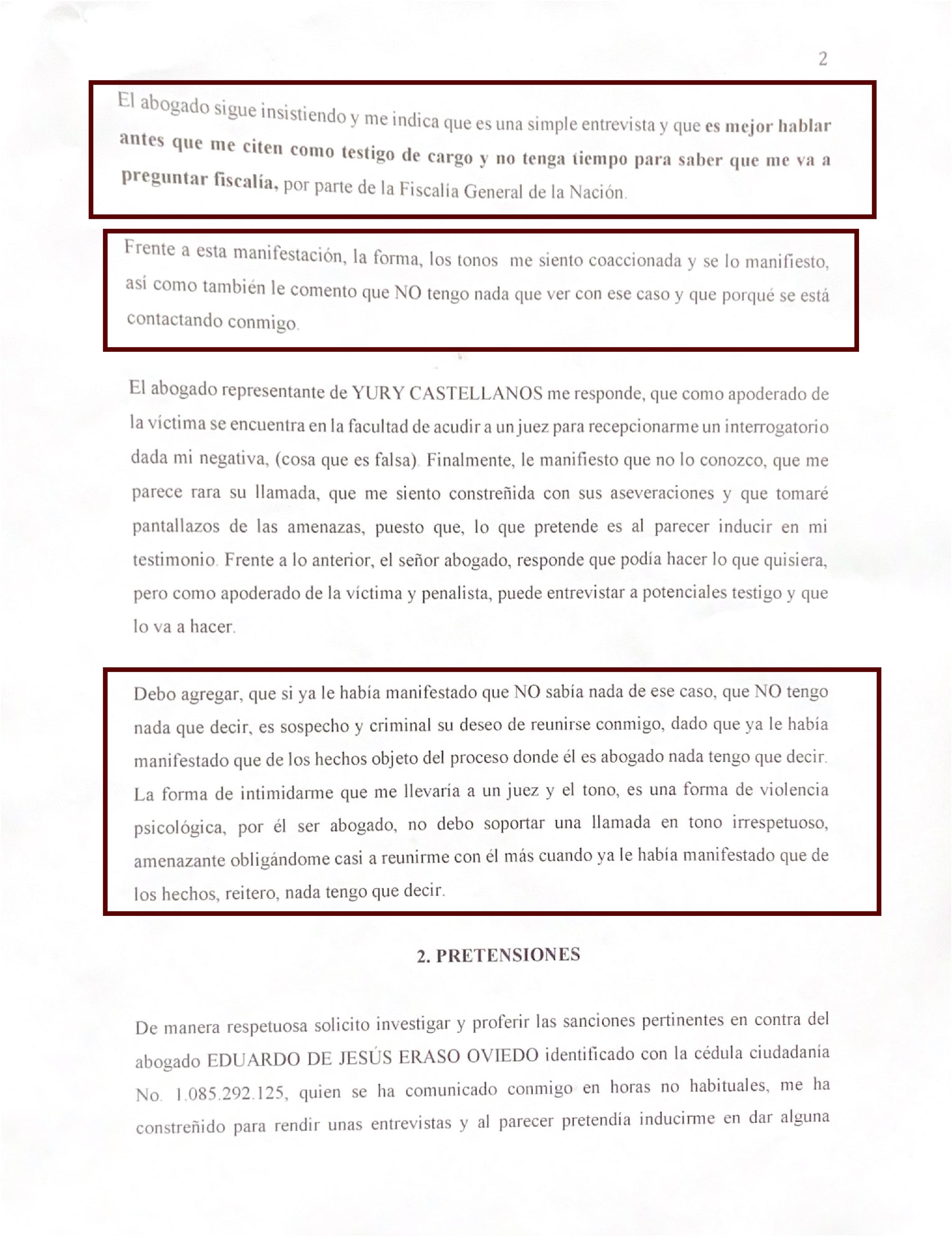 “Debo manifestar que, si ya le había manifestado que no sabía nada de ese caso, que no tengo nada que decir, es sospechoso y criminal su deseo de reunirse conmigo, dado que ya le había manifestado que de los hechos objeto del proceso donde él es abogado nada tengo qué decir”, se lee en la queja.