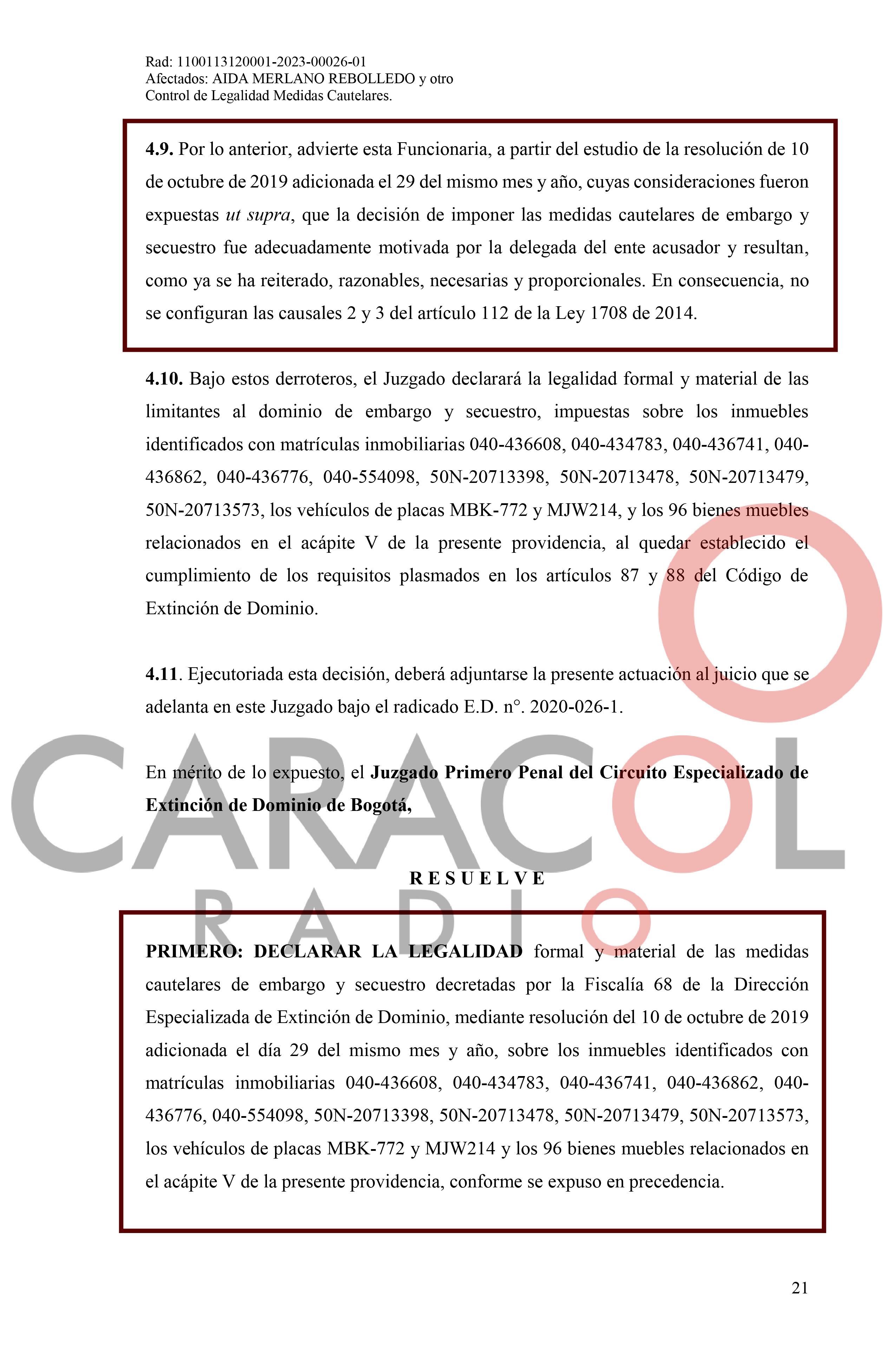 Decisión de la jueza que dejó en firme el decomiso y el proceso de extinción de dominio de los bienes de la condenada excongresista Aida Merlano