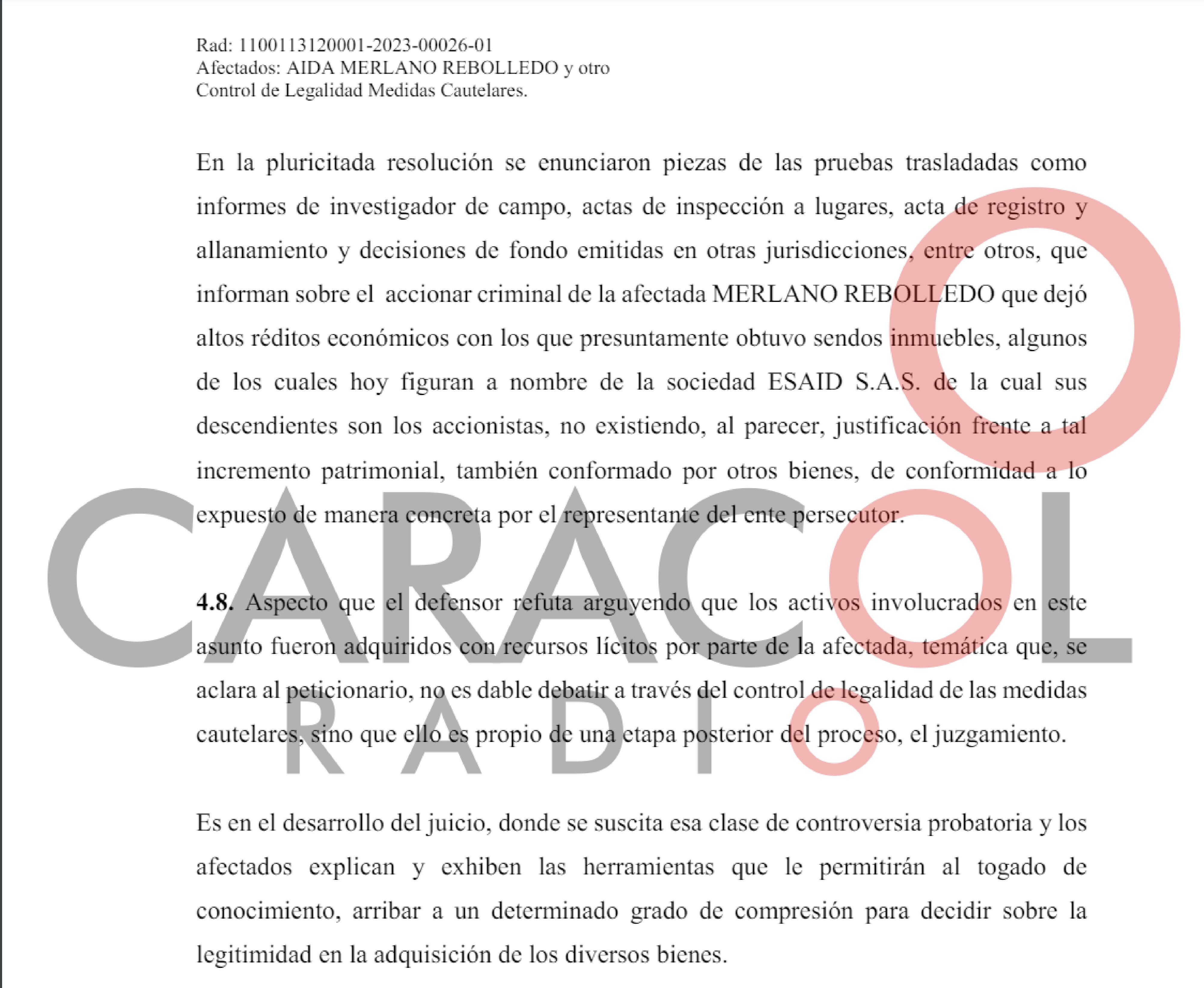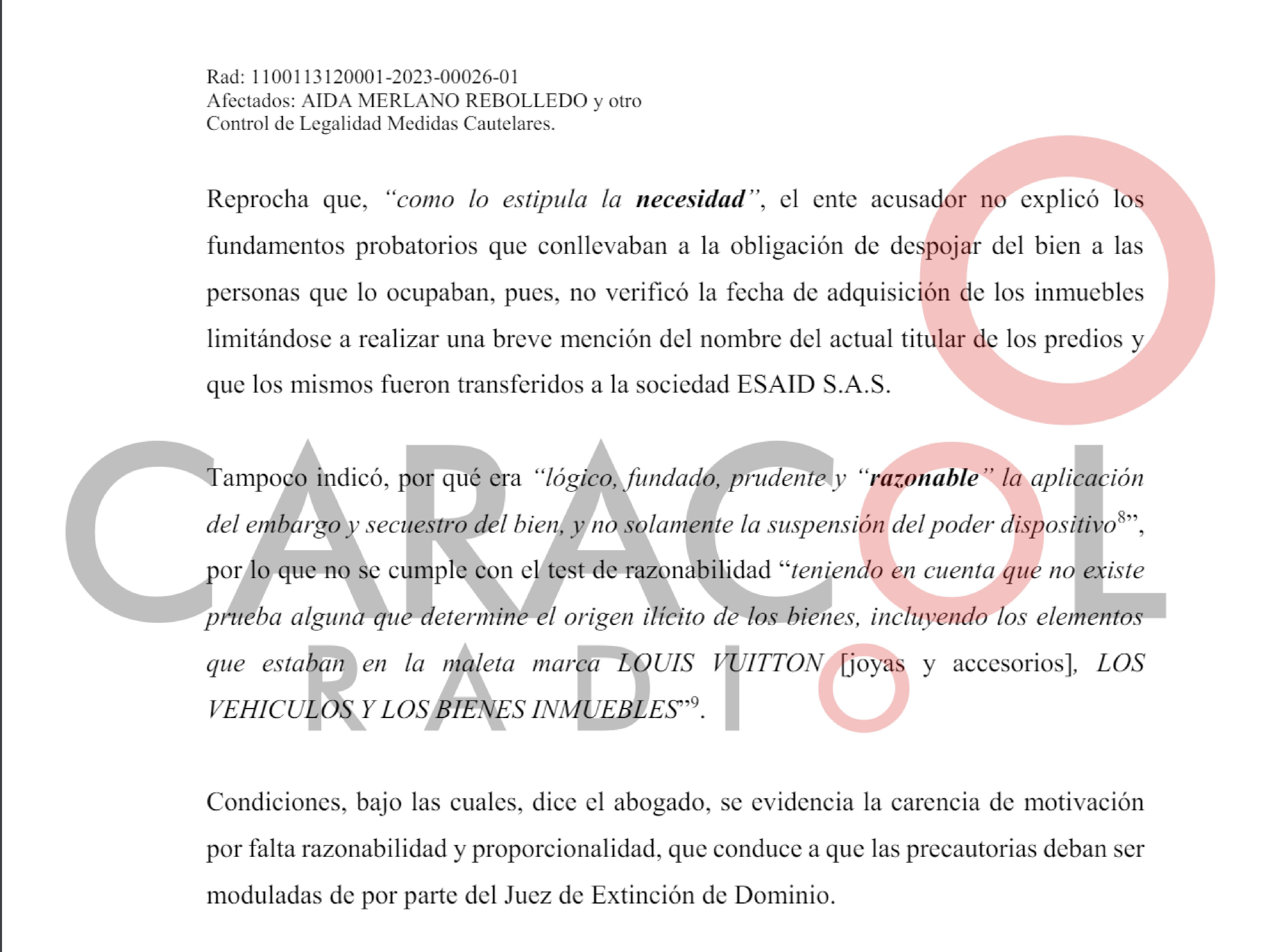 La jueza, al analizar el caso, determinó que no es procedente la petición de la defensa de la excongresista Aida Merlano, porque está en curso un juicio en extinción de dominio, y es en ese proceso donde debe debatir la legitimidad del decomiso de esos bienes.