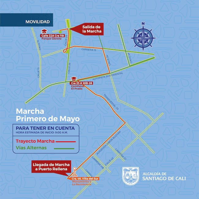 En Cali la marcha del 01 de mayo está convocada a las 09:00 de la mañana en el Parque Obrero para conmemorar el Día Internacional del Trabajo, donde se reúnen en un mismo espacio sindicatos y trabajadores de otros sectores, especialmente el oficial.