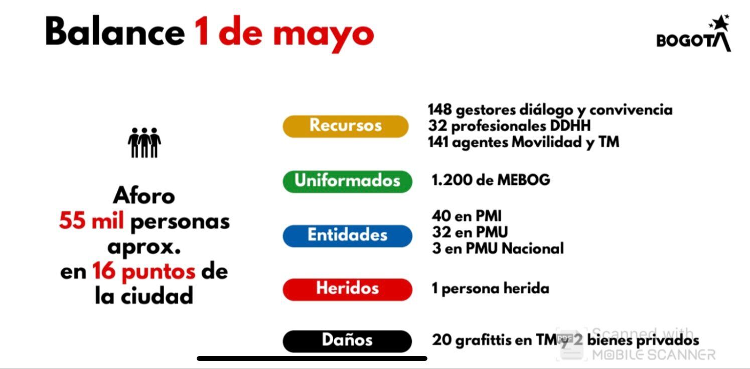 Según la información de la alcaldía de Bogotá, durante las movilizaciones del 1 de mayo en Bogotá, las más recientes, hubo un aforo aproximado de 55 mil personas, según el PMU en 16 puntos de la ciudad.