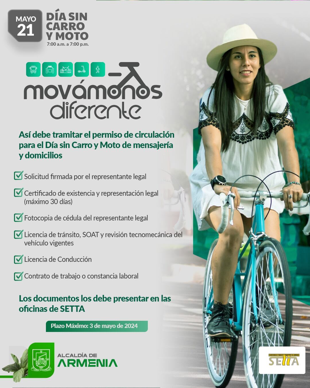 El día sin carro y sin moto será el martes 21 de mayo de 7:00AM A 7:00PM en todo el perímetro urbano de Armenia